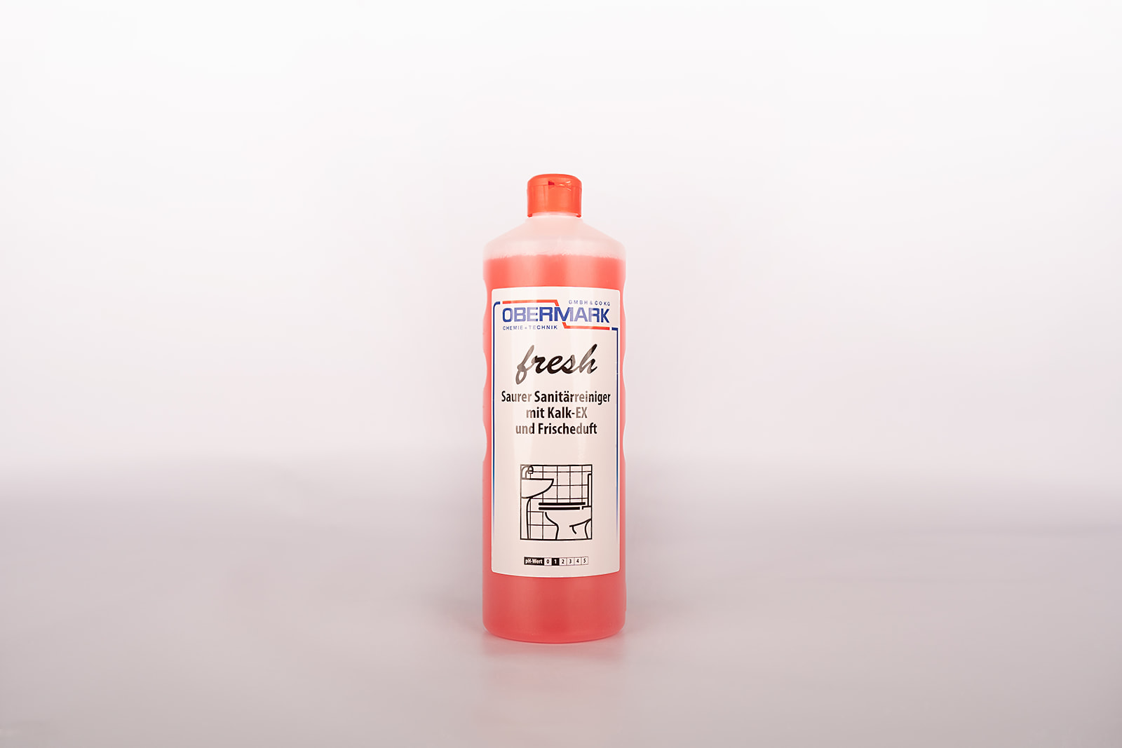 Fresh ist unser saurer Sanitärreiniger für die schnelle und gründliche Reinigung aller säurebeständigen Oberflächen. Er entfernt Kalk- und Wasserreste von Armaturen, Duschabtrennungen , Fliesen sowie Urin- Wasserstein von keramischen Flächen. Konzentriert angewendet sorgen die Wirkstoffe für eine hygienisch einwandfreie Fläche. Geeignet für Sprühsysteme, Schaumkanonen und Hochdruckreiniger. Der Sanitärreiniger hinterlässt einen frischen, langanhaltenden Duft.